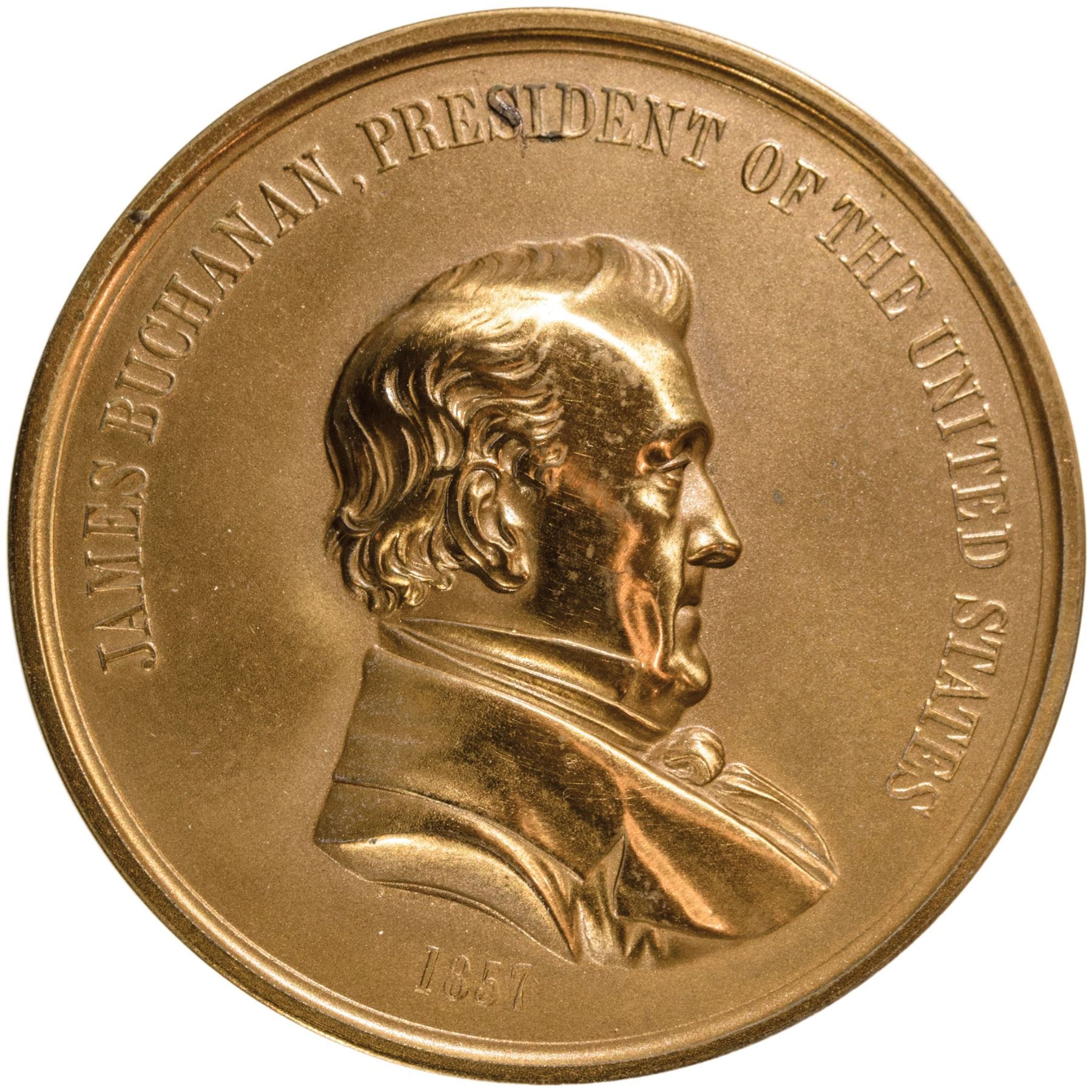Julian IP-36. Belden-50. 76mm. This is the largest size Buchanan Indian Peace Medal. It shows a Native American Indian and a Soldier with an American flag and ax between, as the reverse design. The obverse die was engraved by Salathiel Ellis, and the reverse die is by Joseph Willson (a design also used on Pierce and Fillmore medals). This medal has a high-relief obverse profile strike of James Buchanan. It has beautiful, smooth natural golden-brass color, indicative of a quite modern made specimen typically available for sale to collectors from the US Mint.