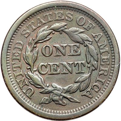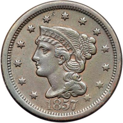 1857 N-1 R1. VF-30. Large Date. Glossy dark olive and steel. A collection of tiny pinpricks over star 6 are the only significant marks. EDS, die state a.