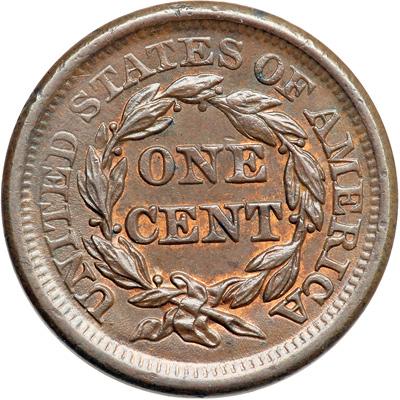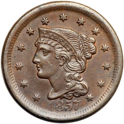 1857 N-1 R1. AU-50. Large Date. Sharpness near mint state but there is a dull rim nick over star 6, several microscopic rim nicks elsewhere on both sides, and an elongated tick in the center of the cheek. Only the mark on the cheek is distracting and the eye appeal of this cent remains quite nice. Lustrous light olive and chocolate with traces of mint red showing on both sides, mostly on the reverse M-LDS, die state b. Removed from an NGC slab graded MS64BN (NGC label included).