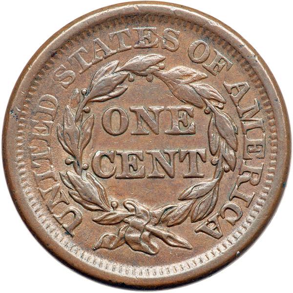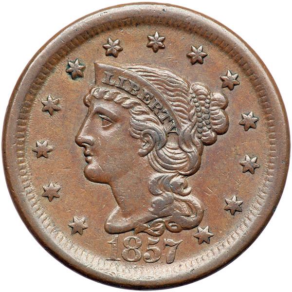 1857 N-1 R1. EF-40 Plus. Large Date. Choice glossy light chocolate brown with satiny luster in protected areas. No defects. Close to EF45. M-LDS, die state b.