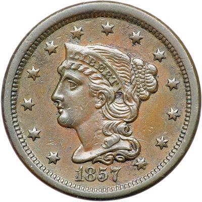 1857 N-2 R1+. EF-45. Small Date. Glossy olive brown and chocolate. Only a few trivial ticks, none notable. The coronet tip is not fully struck up, as usual for the variety, and there are shallow low spots on the neck near the hair. EDS-MDS.