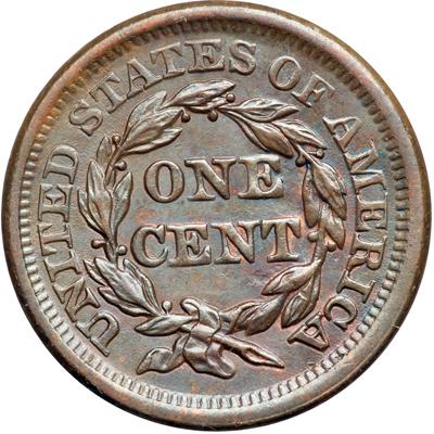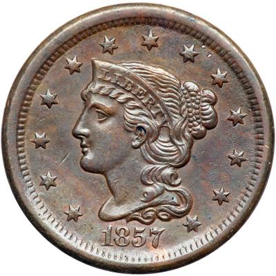 1857 N-4 R1. EF-45 Plus. Small Date. Glossy chocolate brown with traces of original mint red remaining in protected areas, especially on the reverse. Great eye appeal, a thin diagonal nick in the field off the chin from choice. Close to AU50. MDS.