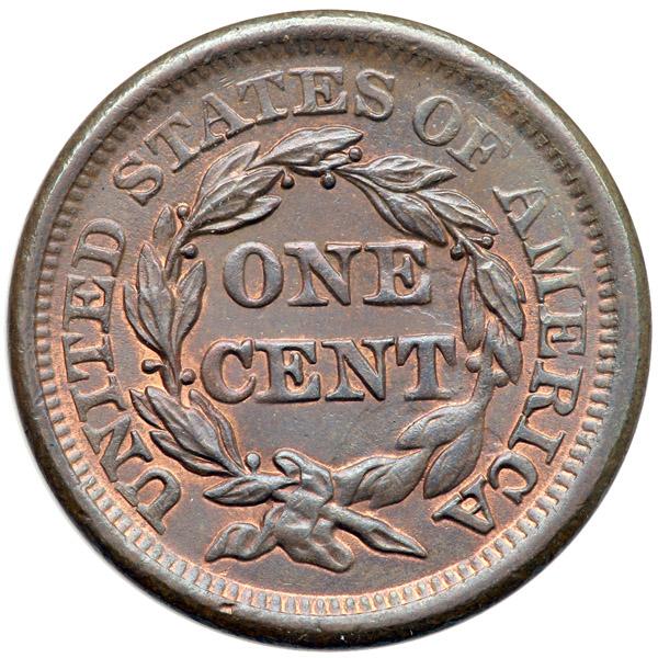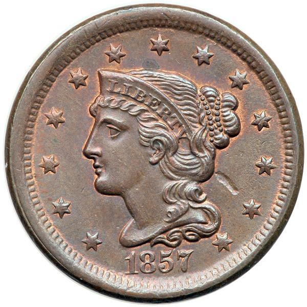 1857 N-4 R1 Small Date MS60+. Lustrous light olive and steel brown with 5-10% of the original mint red remaining. The only marks are a spot of slightly darker toning at the hair under star 7 and a struck-through line (caused by a short piece of wire or other debris stuck on the die) in the field right of the main curl. The struck-through mark catches your eye; otherwise this piece is choice. MDS, die state b.