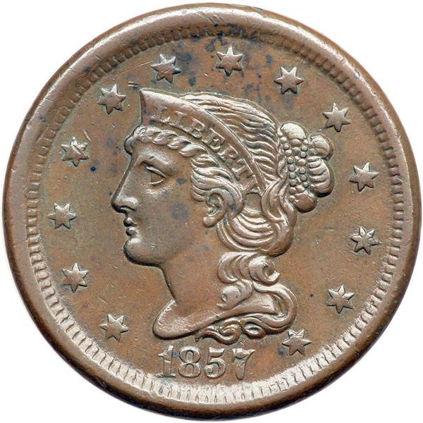 1857 N-4 R1. EF-40. Small Date. Glossy chocolate brown with specks of darker olive toning on the upper part of the obverse. Smooth surfaces void of any notable contact marks. M-LDS.