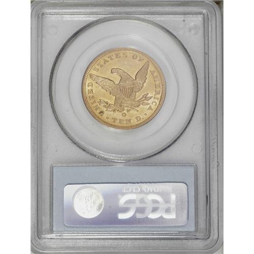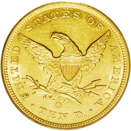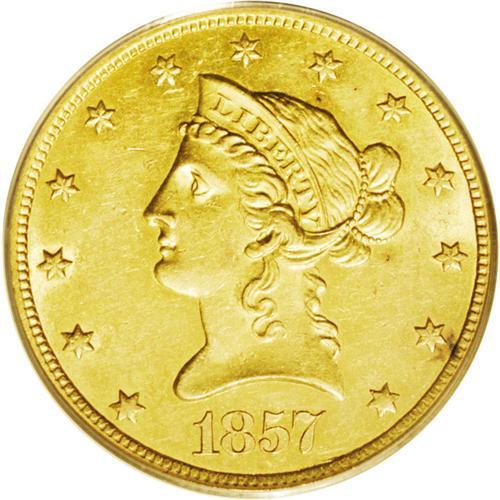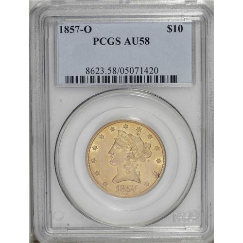 <B>1857-O<$10> AU58 PCGS.</B></I> With a mintage figure of just 5,500 coins, the 1857-O is the third scarcest No Motto eagle from the New Orleans Mint, trailing only the 1841-O and the 1859-O. According to Doug Winter's newly-released second edition of his book <I>Gold Coins of the New Orleans Mint, 1839-1909,</B></I> there are an estimated 70-80 pieces known including 14 to 17 in the various AU grades. The 1857-O is one of the few eagles from this mint that has never been certified by the major services in Uncirculated.<BR> The present example is the finest 1857-O eagle we can recall having seen and it could very possibly be the finest known. It displays magnificent deep, original orange-gold color atop lustrous and uncommonly clean surfaces. We have not been able to verify this but we believe this may, in fact, be the 1999 ANA: 8110 coin (ex: James Stack Collection) that sold for $20,700 seven years ago. The present coin is clearly finer than the ANR 7/05: 306 coin (ex: Warren Miller collection), which was graded AU58 by PCGS and sold to a well-known specialist/collector for almost $20,000.<BR> This is an extremely important coin for the advanced collector as it could very well be the finest known example of one of the rarest New Orleans eagles. Most of the Finest Known or high Condition Census New Orleans eagles from the 1840s and the 1850s are off the market in tightly-held private collections and once this coin is sold, who knows how long before another high-end 1857-O is made available to advanced specialists?