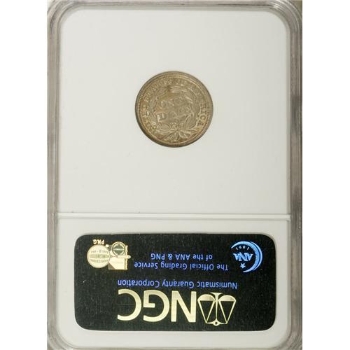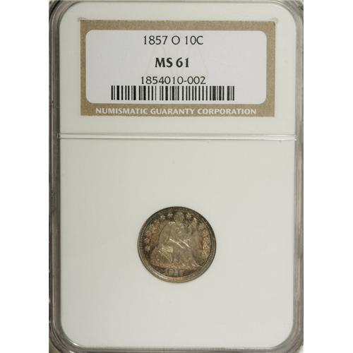 <B>1857-O 10C MS61 NGC.</B></I> Large O. Breen-3305. The Civil War was only four years away when this piece was struck, and the 1857-O would be the last New Orleans issue with a million-plus mintage until 1891. Though both sides of this unworn dime exhibit light to moderate abrasions, the overall visual appeal is strong. Orange-gold toning with ocean-blue at the periphery covers lustrous surfaces.<BR><BR><b>Shipping:</b> Coins & Currency (<a target="_blank" href="http://www.heritageauctions.com/common/shipping.php">view shipping information</a>)