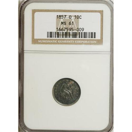 <B>1857-O 10C MS61 NGC.</B></I> NGC Census: (7/86). PCGS Population (4/75). Mintage: 1,540,000. Numismedia Wsl. Price for NGC/PCGS coin in MS61: $492. (#4615)<BR><BR><b>Shipping:</b> Coins & Currency (<a target="_blank" href="http://www.heritageauctions.com/common/shipping.php">view shipping information</a>)