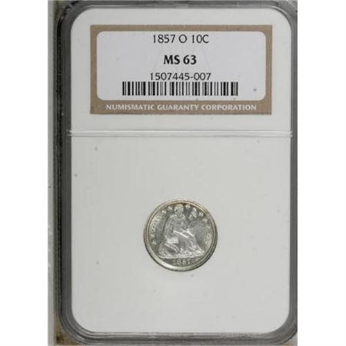 <B>1857-O 10C MS63 NGC.</B></I> NGC Census: (24/52). PCGS Population (23/37). Mintage: 1,540,000. Numismedia Wsl. Price for NGC/PCGS coin in MS63: $700. (#4615)<BR><BR><B>Coin Engraver:</B> Christian Gobrecht<BR><BR><b>Shipping:</b> Coins & Currency (<a target="_blank" href="http://www.heritageauctions.com/common/shipping.php">view shipping information</a>)