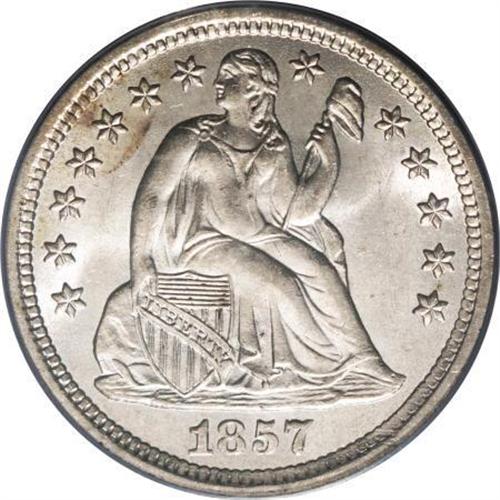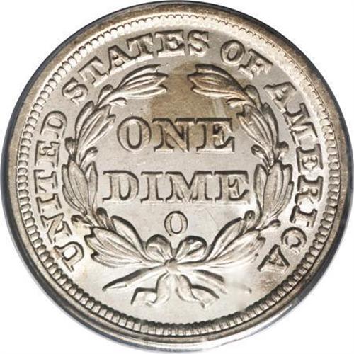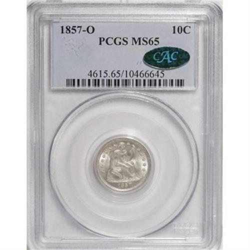 <B>1857-O 10C MS65 PCGS. CAC.</B></I> Large O. Similar to Fortin-102, but no die crack is present between stars 5 and 7. A blush of honey toning graces the upper reverse, while the obverse is nearly brilliant. Well struck save for dentils near the date and STATES OF. Exquisite for the grade despite delicate marks beneath the M in DIME. An available date in worn grades, but very scarce in Mint State, and rare as a Gem. Population: 9 in 65, 9 finer (11/07).<BR><BR><B>Coin Engraver:</B> Christian Gobrecht<BR><BR><b>Shipping:</b> Coins & Currency (<a target="_blank" href="http://www.heritageauctions.com/common/shipping.php">view shipping information</a>)