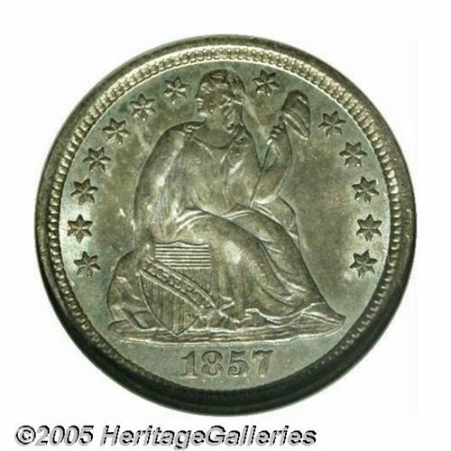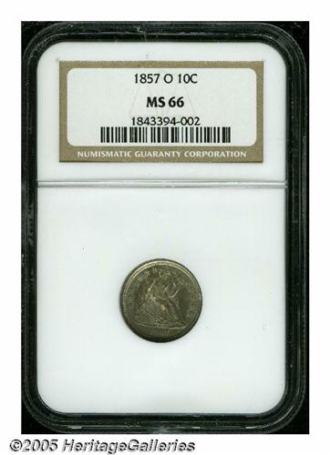 <B>1857-O<10C> MS66 NGC.</B></I> With an original mintage of 1.5 million pieces, the '57-O is anything but rare in lower grades. On the other hand, this semi-prooflike Gem is right up near the top of the Condition Census for the issue. Rich blue-gray toning is noted everywhere except the protected areas where deeper blue has gathered. Fully struck with no mentionable abrasions, this coin belongs in an advanced type set. Population: 8 in 66, 7 finer (4/05).