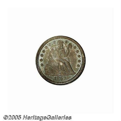 <B>1857-O<10C> MS66 NGC.</B></I> With an original mintage of 1.5 million pieces, the 1857-O is anything but rare in lower grades. On the other hand, this semi-prooflike Gem is right up near the top of the Condition Census for the issue. Rich blue-gray toning is noted everywhere except the protected areas where deeper blue has gathered. Fully struck with no mentionable abrasions, this coin belongs in an advanced type set. Two complex die cracks are found on the reverse, one down through the left side of the second T in STATES, with a branch to A, and another die crack through the right serif of the final A in AMERICA, with a branch to the branch, as it were. Population: 8 in 66, 7 finer (6/05).