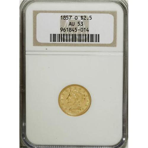 <B>1857-O $2 1/2 AU53 NGC.</B></I> A bright and brilliant example of this low mintage issue (34,000 pieces produced) of which no more than a few hundred remain available to collectors today. The surfaces are pleasingly bright and free of individually offensive marks and the overall appeal is tremendous.<BR><BR><B>Coin Engraver:</B> Christian Gobrecht<BR><BR><b>Shipping:</b> Coins & Currency (<a target="_blank" href="http://www.heritageauctions.com/common/shipping.php">view shipping information</a>)