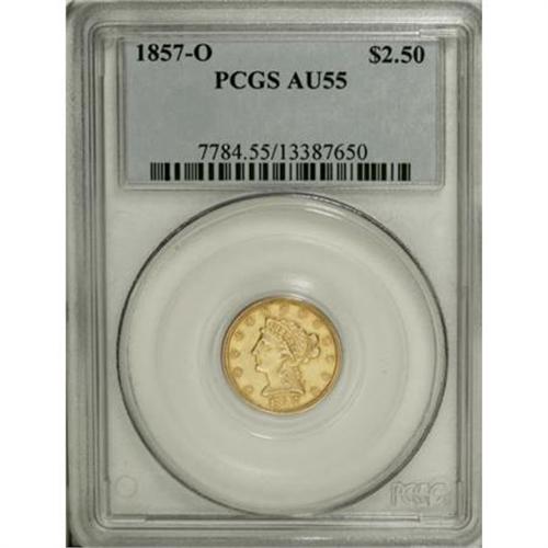 <B>1857-O $2 1/2 AU55 PCGS.</B></I> A lovely Choice AU representative of the final New Orleans quarter eagle issue, well-defined overall with a touch of highpoint wear. The lustrous yellow-gold surfaces show a measure of orange at the margins. Population: 21 in 55, 44 finer (11/07).<BR><BR><B>Coin Engraver:</B> Christian Gobrecht<BR><BR><b>Shipping:</b> Coins & Currency (<a target="_blank" href="http://www.heritageauctions.com/common/shipping.php">view shipping information</a>)