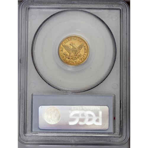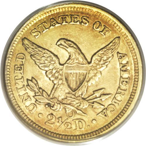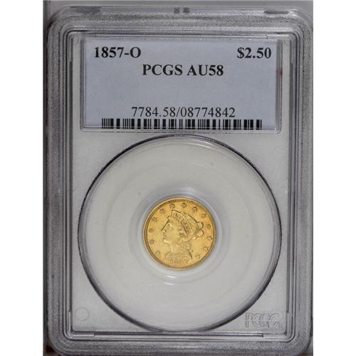 <B>1857-O<$2 1/2> AU58 PCGS.</B></I> This is the final quarter eagle issued at the New Orleans Mint, with a total production of just 34,000 coins. The surfaces have frosty honey-gold luster with splashes of deeper orange toning. A few modest surface marks and a trace of wear are consistent with the grade.