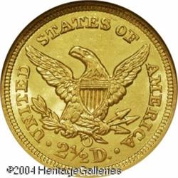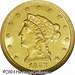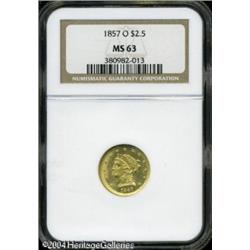 1857-O $2 1/2 MS63 NGC. A rare New Orleans issue e <B>1857-O $2 1/2 MS63 NGC.</B></I> A rare New Orleans issue even after a small hoard of 20-30 pieces turned up in Tennessee several years ago. This is one of the finest pieces certified by either of the grading services. Typical for the issue, this piece shows slightly soft detailing on the hair curls and the plumage on the eagle in the central portions. There are a couple of small field marks in the right reverse field, these being the principal grade-limiting factor. Population: 7 in 63, 1 finer (11/04). <BR><BR><B>Important notice:</B> Heritage usually auctions material at the rate of 200-250 lots per hour. On some occasions eBay Live bid software or the Internet may not be able to keep up with the pace of the auction. We recommend placing a realistic absentee bid now as insurance to avoid disappointment. Occasionally the auctioneer may eliminate or reject an eBay Live bid, and the auctioneer may also reopen a lot after the close of the eBay live bidding (usually because we missed an audience bid), and may reject your bid even if it shows you as the winning bidder. By bidding via eBay Live, you agree that Heritage may award the lot to another bidder at its sole discretion under the circumstances described above or any other reasonable circumstances. Since eBay bids are not shown to us until we open the lot on the floor, we treat those bids just like floor bids. In most cases the floor responds before the eBay bid is presented to us, due to Internet lag time, so for consistency we have made it a policy that floor bids are always considered first over tie eBay live bids. Also please note that all Heritage lots purchased through eBay Live carry a 20% Buyer's Premium. Please make sure you read the Terms and Conditions before you bid. This lot is being auctioned in conjunction with a live floor auction by Heritage Galleries & Auctioneers. All final auction and invoice information will be supplied by Heritage Galleries & Auctioneers, and all other information should be considered preliminary. Lot:6503
