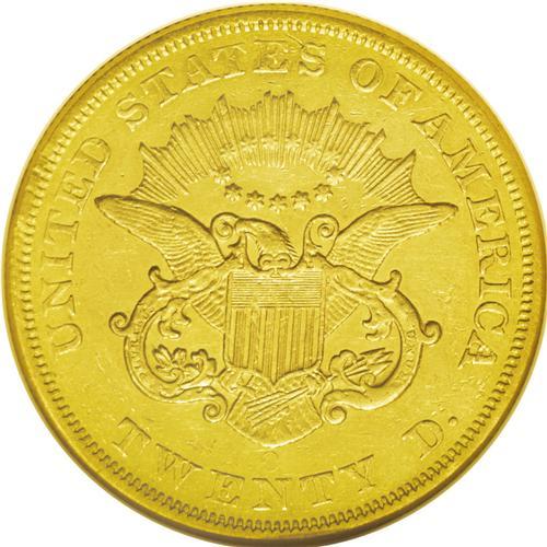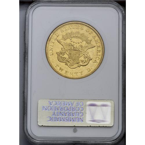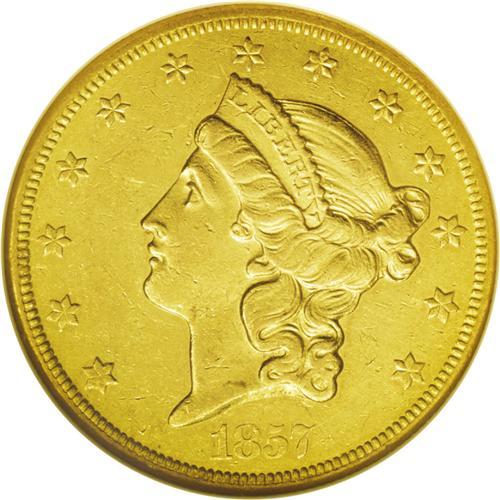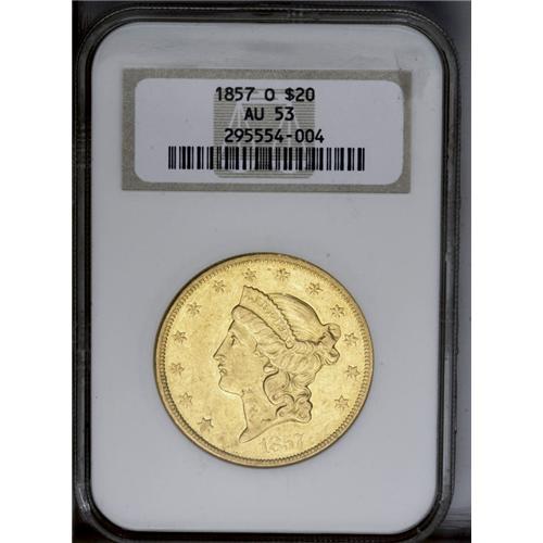 <B>1857-O<$20> AU53 NGC.</B></I> Two elusive double eagles from the 1850s are the 1855-O and the 1857-O issues, although to a certain extent, these two issues reside in the shadows of the 1854-O and 1856-O rarities. In 1857, the New Orleans Mint only coined 30,000 double eagles, and a small percentage still exist today. In all grades, it is doubtful that more than 150 examples are currently known, just half of 1% of the original mintage. The majority of surviving coins are in the VF and XF grades, according to Bowers, with few AU survivors. Mint State coins are essentially non-existent. This example is an attractive green-gold representative, with traces of wear only on the highest design points. Prooflike surfaces exhibit a moderate quota of the small abrasions that these large gold coins are known for. Although the date and mintmark are both weakly impressed, all remaining design details are boldly rendered. Minor disturbances along the left reverse border may assist in pedigree tracking.<BR><I>From The Wyoming Collection.</B></I>