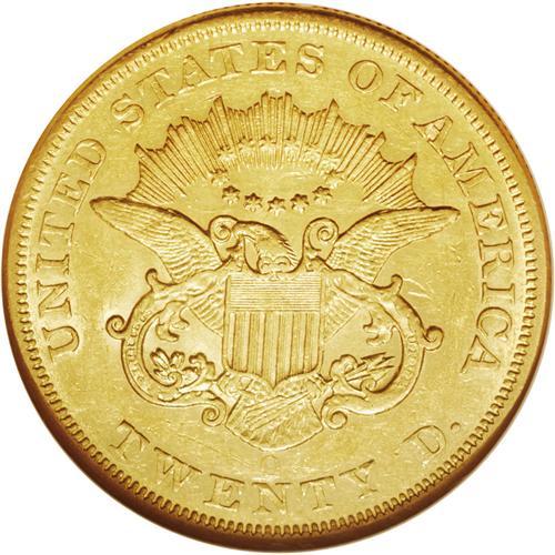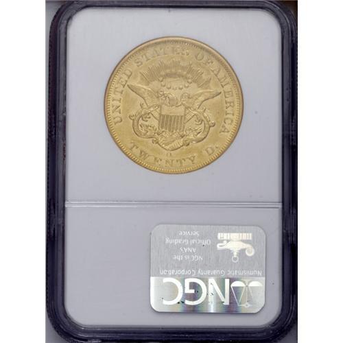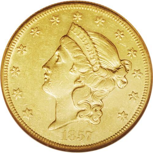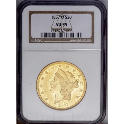 <B>1857-O $20 AU55 NGC.</B></I> A difficult and traditionally overlooked New Orleans twenty from a mintage of just 30,000 pieces. This high grade and still-prooflike example displays pleasing green-gold color beneath tinges of milky reddish patina. Numerous small to medium-sized abrasions infiltrate both sides, the most noticeable being a vertical cut down the inside of Liberty's mouth. Census: 23 in 55, 20 finer (1/06).