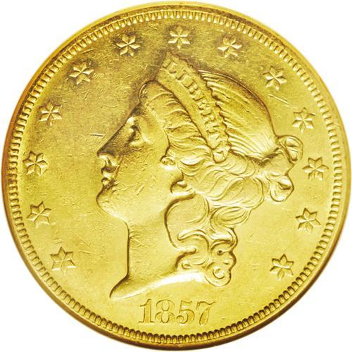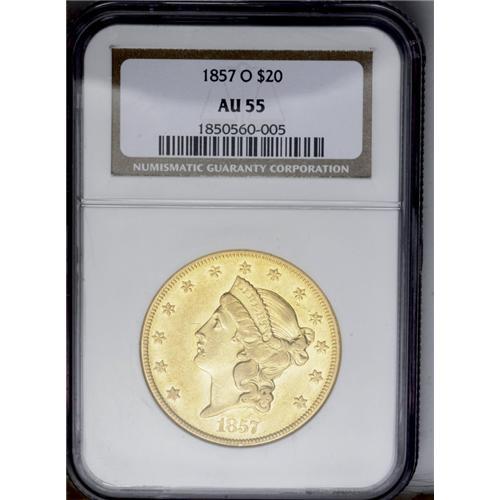 <B>1857-O<$20> AU55 NGC.</B></I> This is an impressive near-Mint example from a low mintage of just 30,000. Although not the major rarity of the 1854-O or 1856-O double eagles, this date is certainly important, and seldom found any finer. Dave Bowers estimated the surviving population in all grades at less than 150 pieces. Although the fields are lightly abraded, this is an attractive example with rich green-gold color and reflective, nearly prooflike surfaces. A few minor nicks are present, including a shallow vertical mark on Liberty's cheek near the mouth. Not fully struck, however, all of the design details are complete and nicely defined. Census: 23 in 55, 23 finer (5/06).