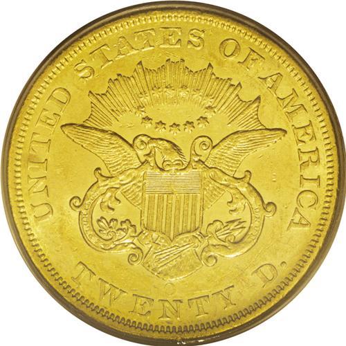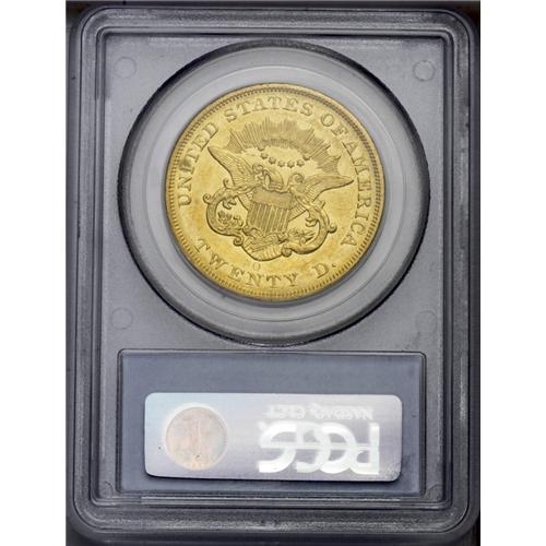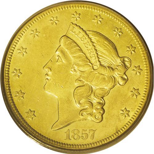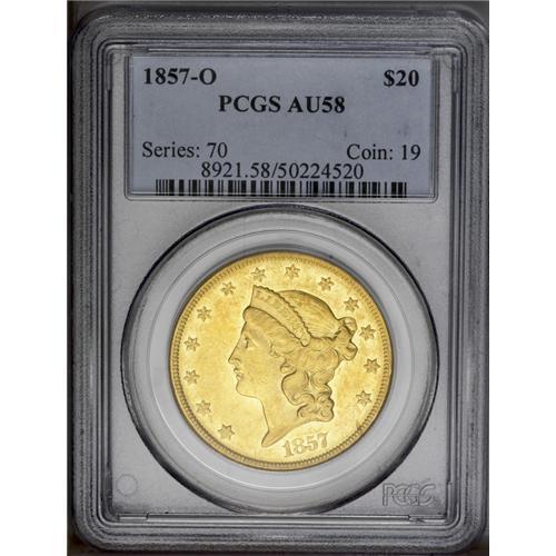 <B>1857-O<$20> AU58 PCGS.</B></I> The 1857-O is the seventh-rarest of 12 New Orleans double eagle issues in terms of overall rarity, and eighth in high grade rarity. It is more available than the 1858-O in About Uncirculated.<BR> Uncommonly well struck, there is little evidence of the striking softness one expects of this issue. Of course, the date and mintmark were lightly punched in the die, but this is not a function of striking. As always, the fields are bright and semi-prooflike and the coin has a rich green-gold hue. Modestly abraded, we note a few small pinscratches on each side, while highpoint wear is nearly nonexistent. Population: 7 in 58, 1 finer (6/06).<BR><I>From The New York Eye Appeal Collection.</B></I>