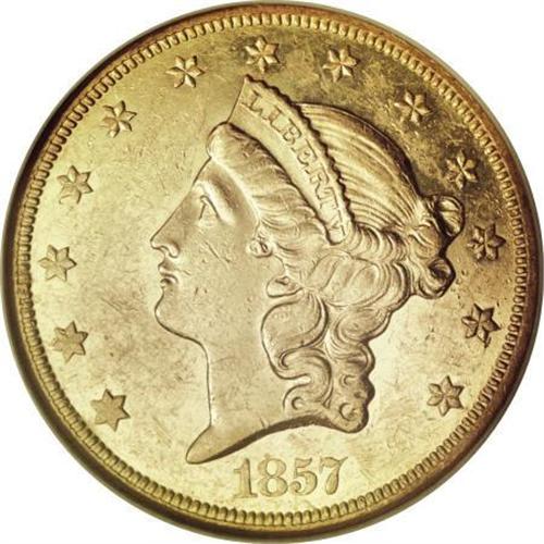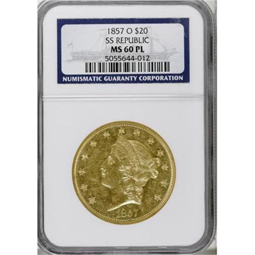 <B>1857-O $20 MS60 Prooflike NGC.</B></I> Ex: <I>S.S. Republic</B></I>. In his second edition of <I>Gold Coins of the New Orleans Mint</B></I>, Doug Winter lists seven distinct Uncirculated pieces in his informal census of 1857-O double eagles, with an additional listing of the eighth Mint State coin in the combined certified population. Since publication, no new Mint State examples have surfaced (1/08). The present coin, number 6 on the list, has gleaming, distinctly reflective yellow-gold surfaces that show no trace of wear. The strike is distinctly above-average, with uncommonly strong definition on the portrait and the peripheral stars of the obverse. While numerous light to moderate abrasions pepper each side, the coin retains significant visual appeal. A fascinating and historic example of this popular O-mint issue.<BR><BR><B>Coin Engraver:</B> James B. Longacre<BR><BR><b>Shipping:</b> Coins & Currency (<a target="_blank" href="http://www.heritageauctions.com/common/shipping.php">view shipping information</a>)