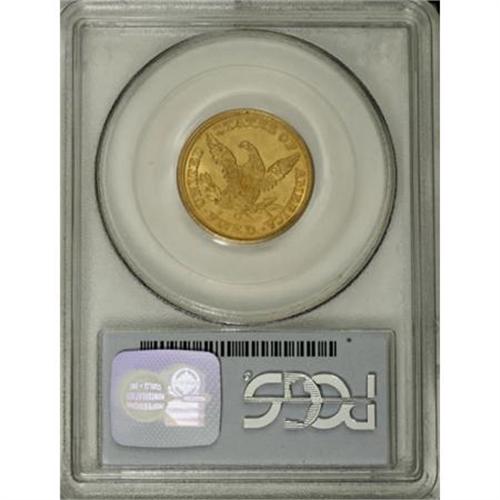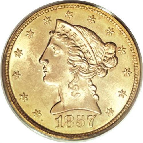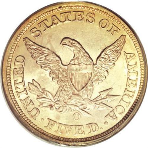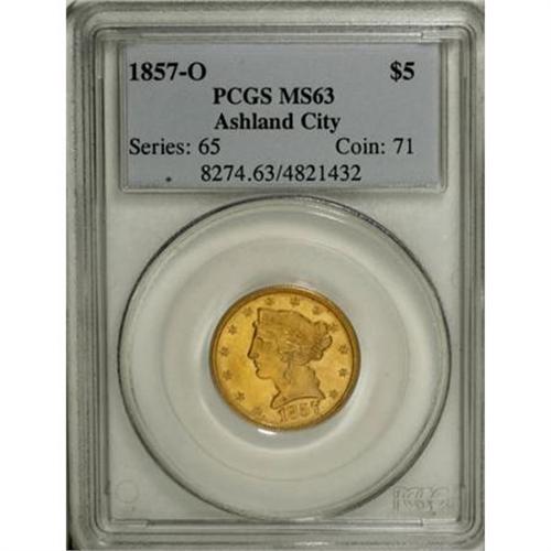 <B>1857-O $5 MS63 PCGS.</B></I> Ex: Ashland City. This is the finest certified 1857-O half eagle, the finest currently known, and likely to remain so for the foreseeable future. It is the only one certified MS63 at PCGS, with none finer, and there are none its equal at NGC (1/08). It was unlisted in Douglas Winter's 1992 reference on the series, and in his 2006 revision it is listed as the finest known by two grade points. <I>Winter specifically cites this coin as the "undisputed finest known example." </B></I><BR> The New Orleans Mint half eagles of the 1850s are historic and numismatically significant pieces in their own right. The 1857-O was the last O-mint half eagle minted before the Civil War, the last produced for some 35 years until the 1892-O.<BR> This is truly an exceptional coin. The surfaces are softly frosted, with a faint glimmer of reflectivity in the fields. The devices are sharply struck, with all star centrils full and the beaded hair cord complete. A touch of softness appears on the upper hair bun and below the coronet, and on the reverse there is a bit of softness on the eagle's right (facing) claw and on the arrow fletchings. The central shield and wing feather details are extremely well delineated. The second vertical stripe in the first pair is broken, a die diagnostic of the issue. Each side has taken on a rich accent of golden-orange patina. The surfaces are remarkably clean for a coin of this grade. A thin, straight scrape runs from behind Liberty's eye downward to her chin, useful for pedigree purposes. A memorable coin, and a must-have for Registry Set collectors or those desiring a historic high-grade example of New Orleans gold.<BR><I>Ex: Ashland City Collection (Heritage, 1/2003), lot 4800, which brought $40,250; Delaware Valley Rare Coins.</B></I><BR><BR><B>Coin Engraver:</B> Christian Gobrecht<BR><BR><b>Shipping:</b> Coins & Currency (<a target="_blank" href="http://www.heritageauctions.com/common/shipping.php">view shipping information</a>)