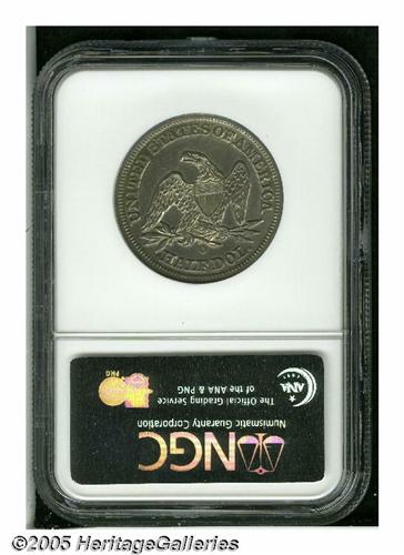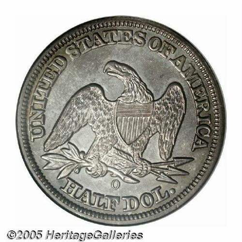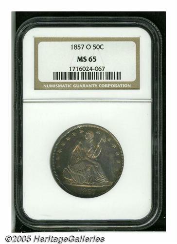 <B>1857-O<50C> MS65 PCGS.</B></I> The 1857-O Half Dollar meets all the requirements of a classic condition rarity. Its mintage of 818,000 pieces is a bit lower than some of its New Orleans Mint contemporaries, but hardly small enough to signal anything out of the ordinary, and its relative availability in circulated condition continues through the XF grade level. However, demand for silver coinage must have been very high in the Antebellum South, as precious few examples appear to have survived in AU and Uncirculated grades. The presently offered Gem representative is among the finest '57-O Halves extant, being clearly nicer than the MS64 sold in our August 2004 Pittsburgh Sale and exceeded in grade at the major services by just a single MS66 certified by NGC (5/05). The coin itself displays dazzling semi-prooflike luster and is sharply struck with the exception of a couple of isolated star radials. Both sides are layered in beautiful orange and olive-gray patina, while flashes of blue iridescence peek out from the obverse border. Specialists in O-mint silver might have to wait years or even decades before the opportunity to acquire a comparable example comes around again. Population: 1 in 65, 1 finer (5/05).