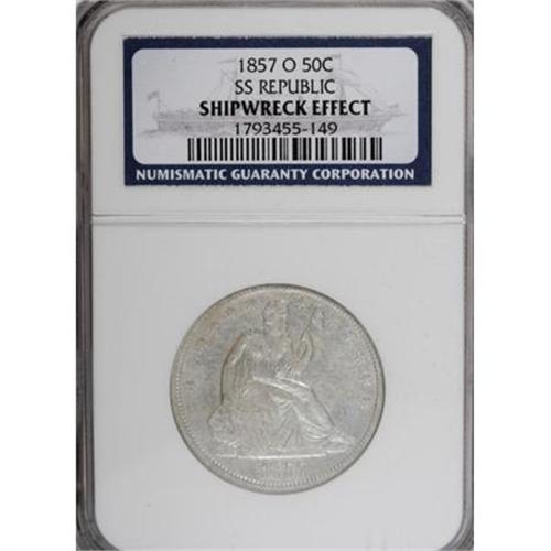 <B>1857-O 50C Shipwreck Effect NGC.</B></I> Ex: S.S. Republic. This stone-gray example has XF sharpness, although no details grade is listed on the NGC holder. Subdued and evenly granular from its long rest in the Atlantic Ocean. Each side has a noticeable scratch. A presentation case, certificate of authenticity, booklet, and DVD accompany the lot.<BR><BR><B>Coin Engraver:</B> Christian Gobrecht<BR><BR><b>Shipping:</b> Coins & Currency (<a target="_blank" href="http://www.heritageauctions.com/common/shipping.php">view shipping information</a>)