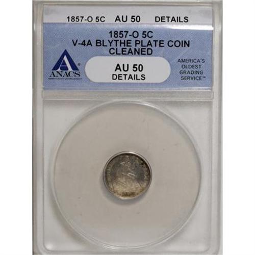 <B>1857-O H10C Blythe Plate--Cleaned--ANACS AU50 Details.</B></I> V-4a. NGC Census: (2/152). PCGS Population (4/126). Mintage: 1,380,000. Numismedia Wsl. Price for NGC/PCGS coin in AU50: $120. (#4366)<BR><I>From The Al Blythe Collection of Half Dimes.</B></I><BR><BR><B>Coin Engraver:</B> Christian Gobrecht<BR><BR><b>Shipping:</b> Coins & Currency (<a target="_blank" href="http://www.heritageauctions.com/common/shipping.php">view shipping information</a>)