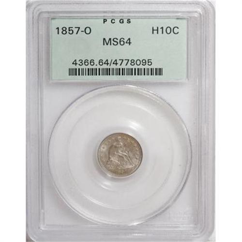 <B>1857-O H10C MS64 PCGS.</B></I> Satiny and well struck, with golden highlights over pearl-gray surfaces. A faint die crack extends through all of the obverse stars. Surface marks are minimal. This scarce near-Gem is housed in an early PCGS holder with a green label. Population: 24 in 64, 34 finer (11/07).<BR><I>From The Casa Becca del Norté Collection.</B></I><BR><BR><B>Coin Engraver:</B> Christian Gobrecht<BR><BR><b>Shipping:</b> Coins & Currency (<a target="_blank" href="http://www.heritageauctions.com/common/shipping.php">view shipping information</a>)