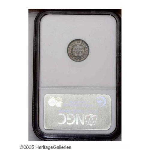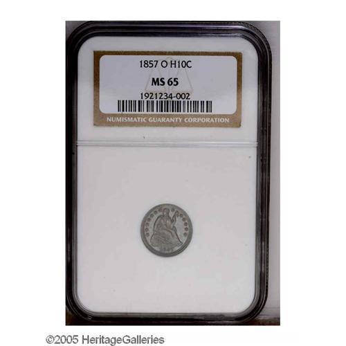 <B>1857-O<H10C> MS65 NGC.</B></I> With 1.38 million pieces struck, the 1857-O is one of the more frequently encountered O-mint Half Dimes. Gems, however, are difficult to obtain. This piece displays beautiful mauve and light blue toning overlaying lustrous surfaces that are devoid of mentionable marks. Census: 12 in 65, 14 finer (11/05).
