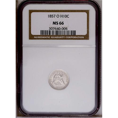 <B>1857-O<H10C> MS66 NGC.</B></I> A remarkable Gem with highly lustrous and frosty obverse surfaces, and fully lustrous and reflective reverse surfaces. This example is almost the quality that some used to call a one-side Proof. In reality, the reverse die had just been polished before this coin was struck, as evidenced by the fine polishing lines that cover the fields. All of the design elements on each side are sharply struck, except for the borders, which lack detail. <BR><BR><B>Important notice:</B> Heritage usually auctions material at the rate of 200-250 lots per hour. On some occasions eBay Live bid software or the Internet may not be able to keep up with the pace of the auction. We recommend placing a realistic absentee bid now as insurance to avoid disappointment. Occasionally the auctioneer may eliminate or reject an eBay Live bid, and the auctioneer may also reopen a lot after the close of the eBay live bidding (usually because we missed an audience bid), and may reject your bid even if it shows you as the winning bidder. By bidding via eBay Live, you agree that Heritage may award the lot to another bidder at its sole discretion under the circumstances described above or any other reasonable circumstances. Since eBay bids are not shown to us until we open the lot on the floor, we treat those bids just like floor bids. In most cases the floor responds before the eBay bid is presented to us, due to Internet lag time, so for consistency we have made it a policy that floor bids are always considered first over tie eBay live bids. Also please note that all Heritage lots purchased through eBay Live carry a 20% Buyer's Premium. Please make sure you read the Terms and Conditions before you bid. This lot is being auctioned in conjunction with a live floor auction by Heritage Galleries & Auctioneers. All final auction and invoice information will be supplied by Heritage Galleries & Auctioneers, and all other information should be considered preliminary. Lot:1895 <BR><BR><B>Winning Notification and Billing:</B> After the FINAL session in this auction is complete, Heritage will send e-mail and snail mail invoices. This process normally takes several days. All final auction and invoice information will be supplied by Heritage Galleries & Auctioneers, and all other information should be considered preliminary. <BR><BR>This auction will be conducted on a live auction floor and over the Internet through eBay Live. If you choose to place an absentee bid, please take a moment to <font color='#0000ff'><u><a href='http://pages.ebay.com/liveauctions/help/before/laabsentee.html'>learn how eBay Live absentee bidding works</a></u></font><font color='#000000'>