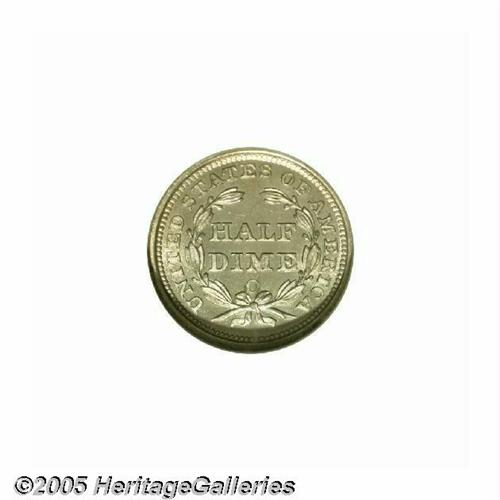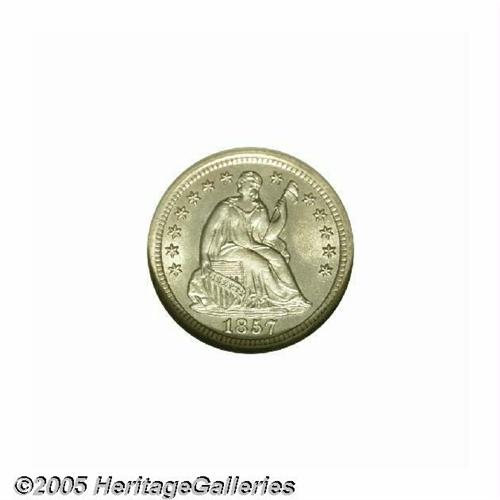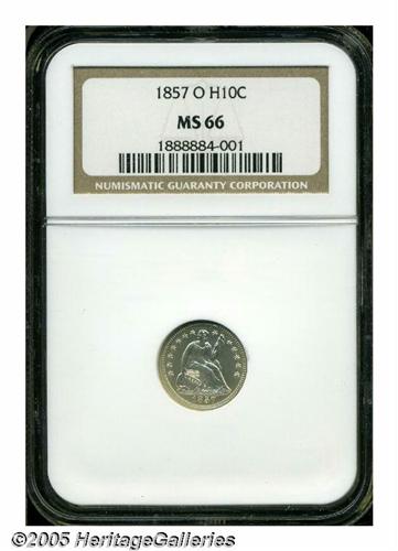 <B>1857-O<H10C> MS66 NGC.</B></I> Despite a mintage well into seven figures, this is a rarity in Gem quality as indicated by the population data. This example is a satiny Gem with almost prooflike fields and excellent aesthetic appeal. It is sharply struck with virtually full white brilliance. An unexplained characteristic: the obverse has a raised, nearly vertical die line in the base of the rock, directly below the left edge of the shield. It appears almost as if it is a misplaced 1, with the serif hidden below the curved drapery of Liberty. The possibility of a newly discovered variety is always exciting. We will rely on the specialists to come to a further conclusion regarding this example, first noticed by the present cataloger (MRB). Population: 8 in 66, 2 finer (5/05).