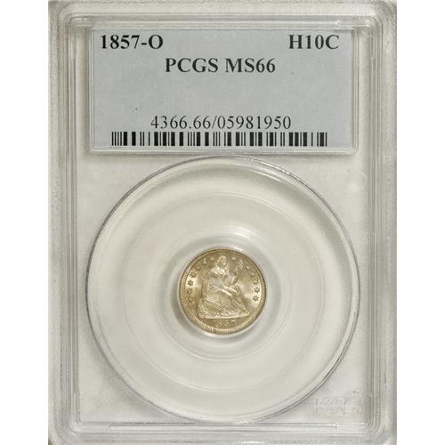 <B>1857-O H10C MS66 PCGS.</B></I> This penetratingly struck Premium Gem features attractive chestnut-gold and lilac toning. Luster dominates the unabraded and flashy surfaces. Anyone in search of the finest quality Seated half dimes should pause to ponder the purchase of this formidable piece. Population: 10 in 66, 4 finer (3/07).<BR><BR><b>Shipping:</b> Coins & Currency (<a target="_blank" href="http://www.heritageauctions.com/common/shipping.php">view shipping information</a>)