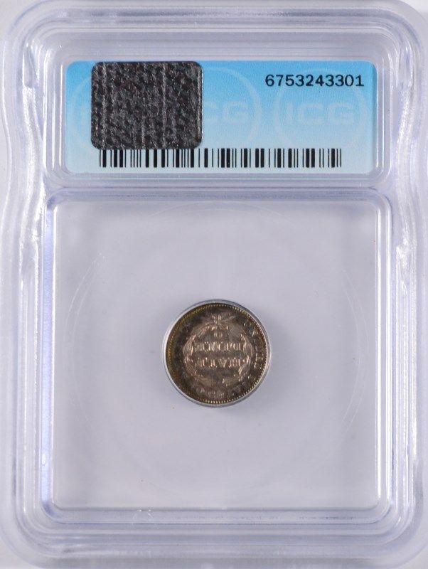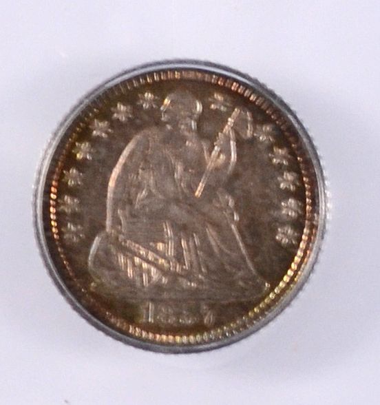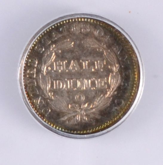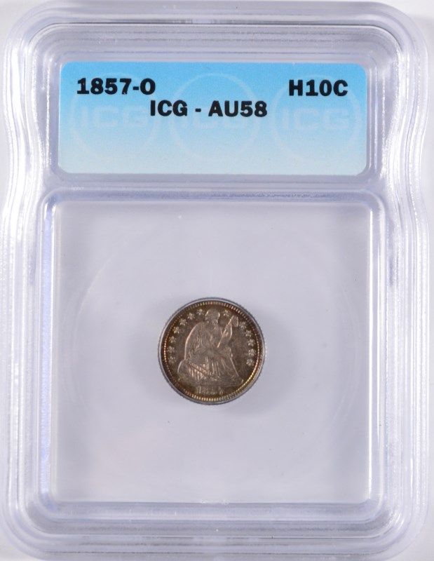 1857-O SEATED HALF DIME, ICG AU-58 BEAUTIFUL RAINBOW COLORS
