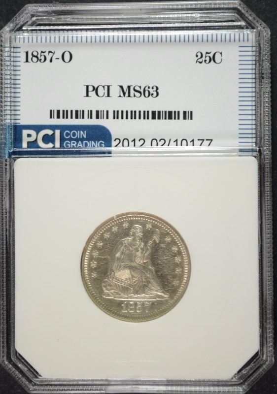 1857-O SEATED QUARTER, PCI CHOICE BU, RARE