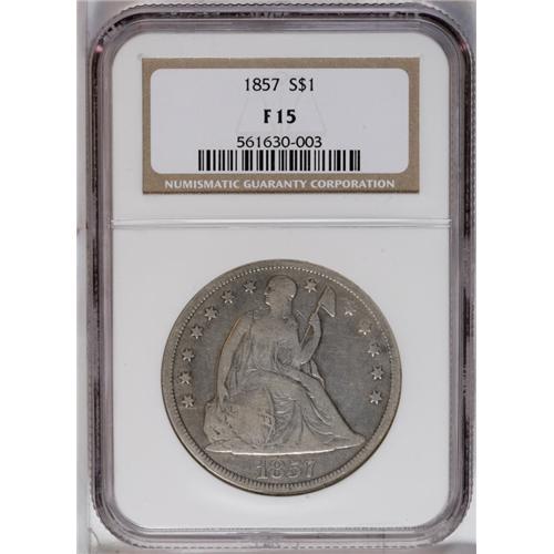 1857 S$1 Fine 15 NGC. Moderate to heavy wear, though s