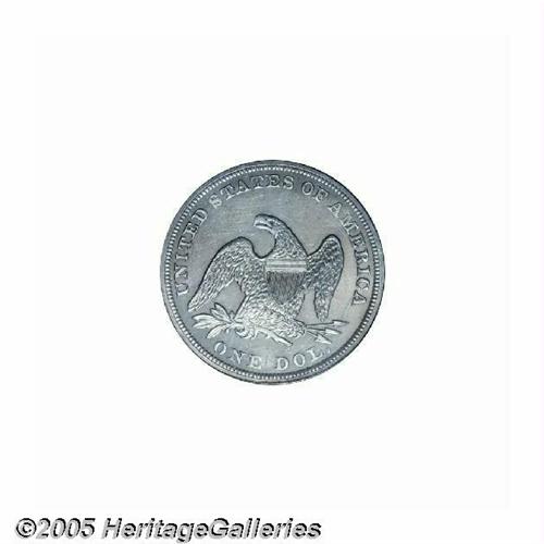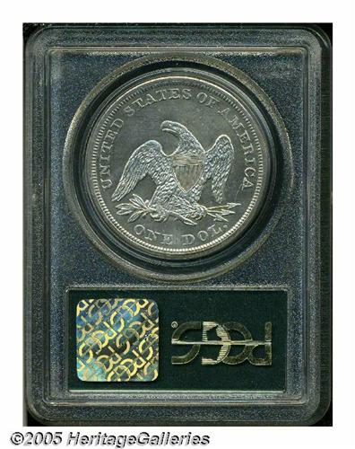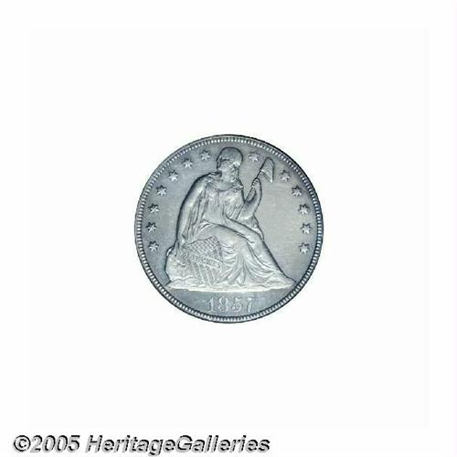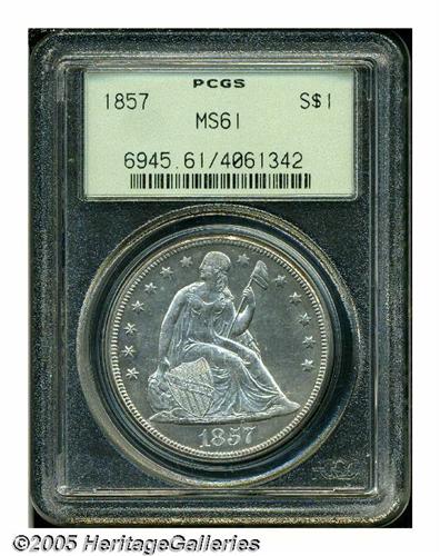 <B>1857<S$1> MS61 PCGS.</B></I> The 1857 is somewhat similar to the 1853. Its relatively large mintage (94,490 pieces) makes it a scarce, but not rare date in circulated grades. In mint condition, the 1857 is one of the more easily obtainable dates from the decade of the 1850s, similar to the 1853, but nowhere near as common as the 1859-O, a hoard date. PCGS has certified a total of 42 Mint State 1857's (6/05). Like many Mint State examples of this issue, the present coin exhibits a partial prooflike finish, and an uneven strike that is particularly soft around the upper and right (facing) obverse periphery. According to Bowers (1993), the latter feature was caused by non-parallel die alignment. The frosted design elements offer a moderate contrast against the fields, giving a cameo-like effect. Both sides are untoned, save for whispers of peripheral light grayish-tan patina. A few trivial contact marks are scattered about, as are some wispy hairlines in the fields.<BR><I>From The Dr. John L. Pellegrini Collection of Liberty Seated Dollars.</B></I>