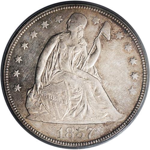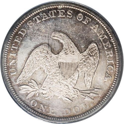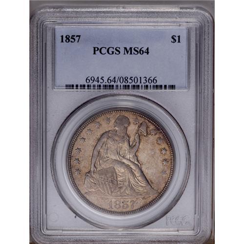 <B>1857<img border='0' src='http://www.heritagecoins.com/images/star.gif' width=10 height=10>$1> MS64 PCGS.</B></I> David Bowers (1993) writes that the 1857 silver dollar was primarily used in the China trade; few, if any, were used in domestic commerce. Mint State pieces can be hard to locate; indeed, PCGS and NGC have certified about 80 Uncirculated coins. The near-Gem presented here displays a thin veneer of gold-tan patination. The fields are partially prooflike, and highlight the motifs when the piece is rotated under a light source. The reverse elements are well impressed, but Liberty's head and some of the star centers are weak, which is typical for the issue. A few minute contact marks are scattered about, as are some wispy hairlines in the fields. Population: 7 in 64, 2 finer (3/06). <BR><BR><B>Important notice:</B> Heritage usually auctions material at the rate of 200-250 lots per hour. On some occasions eBay Live bid software or the Internet may not be able to keep up with the pace of the auction. We recommend placing a realistic absentee bid now as insurance to avoid disappointment. Occasionally the auctioneer may eliminate or reject an eBay Live bid, and the auctioneer may also reopen a lot after the close of the eBay live bidding (usually because we missed an audience bid), and may reject your bid even if it shows you as the winning bidder. By bidding via eBay Live, you agree that Heritage may award the lot to another bidder at its sole discretion under the circumstances described above or any other reasonable circumstances. Since eBay bids are not shown to us until we open the lot on the floor, we treat those bids just like floor bids. In most cases the floor responds before the eBay bid is presented to us, due to Internet lag time, so for consistency we have made it a policy that floor bids are always considered first over tie eBay live bids. Also please note that all Heritage lots purchased through eBay Live carry a 20% Buyer's Premium. Please make sure you read the Terms and Conditions before you bid. This lot is being auctioned in conjunction with a live floor auction by Heritage Galleries & Auctioneers. All final auction and invoice information will be supplied by Heritage Galleries & Auctioneers, and all other information should be considered preliminary. Lot:2183 <BR><BR><B>Winning Notification and Billing:</B> After the FINAL session in this auction is complete, Heritage will send e-mail and snail mail invoices. This process normally takes several days. All final auction and invoice information will be supplied by Heritage Galleries & Auctioneers, and all other information should be considered preliminary. <BR><BR>This auction will be conducted on a live auction floor and over the Internet through eBay Live. If you choose to place an absentee bid, please take a moment to <font color='#0000ff'><u><a href='http://pages.ebay.com/liveauctions/help/before/laabsentee.html'>learn how eBay Live absentee bidding works</a></u></font><font color='#000000'>