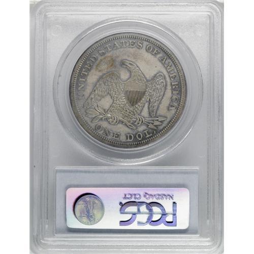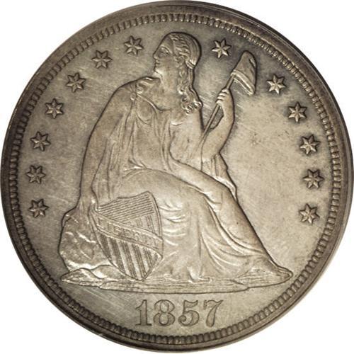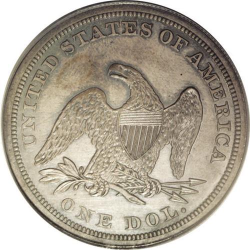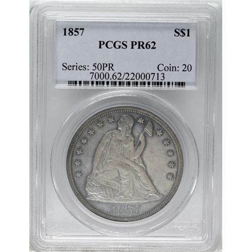 <B>1857 S$1 PR62 PCGS.</B></I> A pleasing example with moderate steel-gray patina, somewhat milky in the fields, and good underlying flashes of proof luster. A circular area of stain is noted to the left of the eagle's head on the reverse. Although the exact mintage from the two die pairings of this year is unknown, it is estimated that between 50 and 100 pieces were struck. Population: 3 in 62, 26 finer (12/06).<BR><BR><b>Shipping:</b> Coin/Currency (<a target="_blank" href="http://www.heritageauctions.com/common/shipping.php">view shipping information</a>)