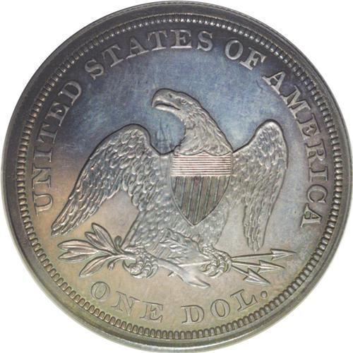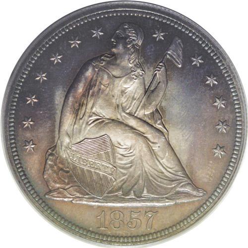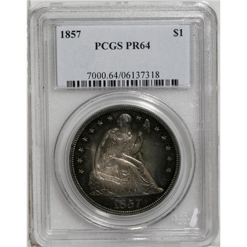 <B>1857<img border='0' src='http://www.heritagecoins.com/images/star.gif' width=10 height=10>$1> PR64 PCGS.</B></I> Breen-5455. This year marked the passing of the large cent, and the Mint struck numerous proof 1857 cents as well as other coins. Pioneer early dealer Edward Cogan marked this as the beginning of a widespread interest in coin collecting in America, and the first professional coin dealers. The 1857 business strike silver dollars were minted primarily for export to China, and few, if any, circulated domestically. Most of the business strikes had prooflike surfaces, to one degree or another. Many of the business strikes, and some proofs struck from the same die, show flatness on Liberty's head. This coin is clearly struck from a different die, as the head is gloriously well struck up. The Bowers-Borckardt volume describes a tiny die flaw as a "beard" below the chin. This example has well mirrored fields with smoke-gray rims, accented by a tinge of blue, and brilliant silver centers on the obverse. The reverse center is copper-hued. Population: 9 in 64, 2 finer (7/06).
