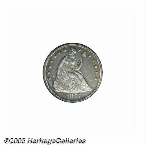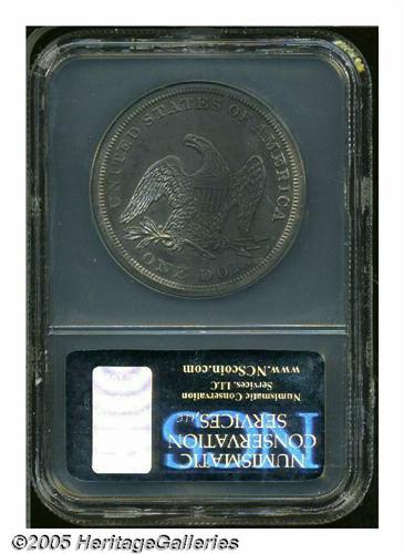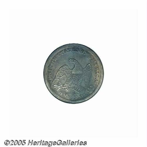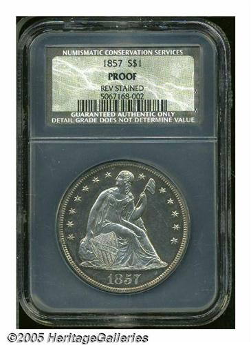<B>1857<S$1> Proof, Reverse Stained, NCS.</B></I> A rare and desirable early proof Seated dollar. Although the exact mintage from the two die-pairings in this year is unknown, it is estimated that between 50 and 100 pieces were struck. The design elements are sharply struck throughout, and the obverse is lightly toned, while the reverse shows a swath of blackish film over the right (facing) side. Wispy hairlines are noted in the obverse fields.<BR><I>From The Dr. John L. Pellegrini Collection of Liberty Seated Dollars.</B></I>