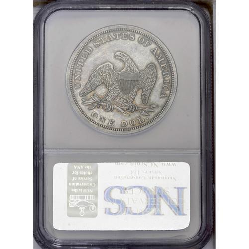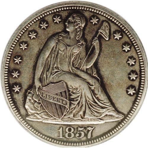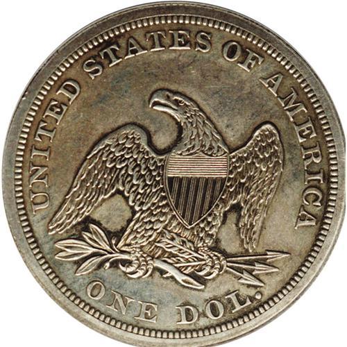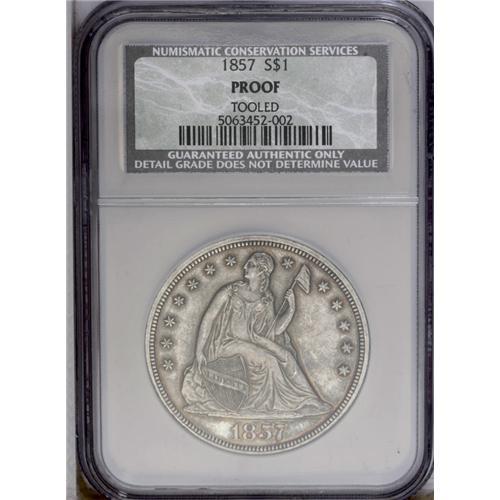 <B>1857<img border='0' src='http://www.heritagecoins.com/images/star.gif' width=10 height=10>$1>--Tooled--NCS.</B></I> At first glance, this boldly struck steel-gray and tan proof No Motto Seated dollar appears to be unimpaired. A closer look reveals a diagonal pinscratch on Liberty's hair, and further inspection locates numerous thin pinscratches that outline the legends and devices. Nonetheless, a rare proof date. The dies are Bowers (1993 <I>Silver Dollar Encyclopedia</B></I>) #1, with a "beard" beneath Liberty's chin and die rust on the L in DOL.