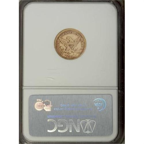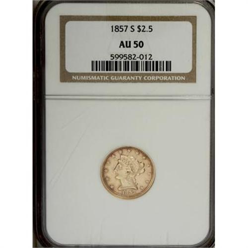 <B>1857-S $2 1/2 AU50 NGC.</B></I> In the initial years of operation at the San Francisco Mint, the priority was placed on coining double eagles, which were needed by local bankers and traders within the bullion-based economy. Quarter eagles were struck only in limited quantities until 1878. This piece has noticeable golden-brown luster and a decent strike. Thin marks are present near the profile and at 6:30 on the reverse.<BR><BR><B>Coin Engraver:</B> Christian Gobrecht<BR><BR><b>Shipping:</b> Coins & Currency (<a target="_blank" href="http://www.heritageauctions.com/common/shipping.php">view shipping information</a>)
