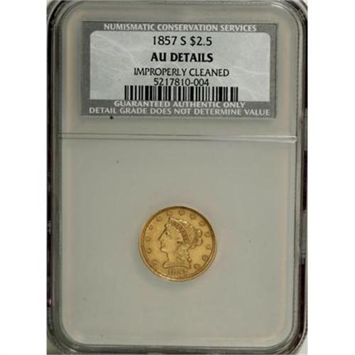 <B>1857-S $2 1/2 --Improperly Cleaned--NCS. AU Details.</B></I> NGC Census: (0/0). PCGS Population (0/0). Mintage: 69,200. (#7785)<BR><BR><B>Coin Engraver:</B> Christian Gobrecht<BR><BR><b>Shipping:</b> Coins & Currency (<a target="_blank" href="http://www.heritageauctions.com/common/shipping.php">view shipping information</a>)