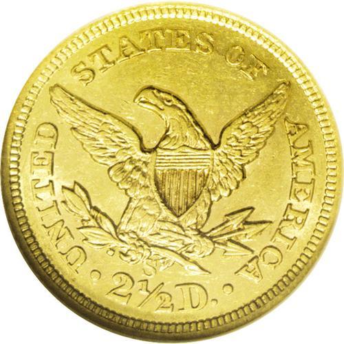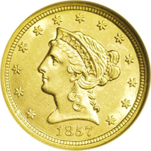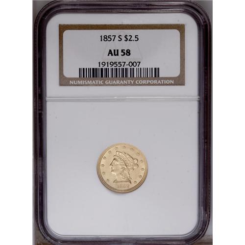 <B>1857-S $2 1/2 AU58 NGC.</B></I> Collectors attempting to acquire an attractive near-Mint example of the 1857-S quarter eagle can ignore its comparatively high mintage of 69,200 pieces because coins meeting these standards are deceptively difficult. Offered here is one of the more appealing pieces we have offered in quite some time, being especially well struck and lustrous on the obverse. Census: 49 in 58, 17 finer (1/06).