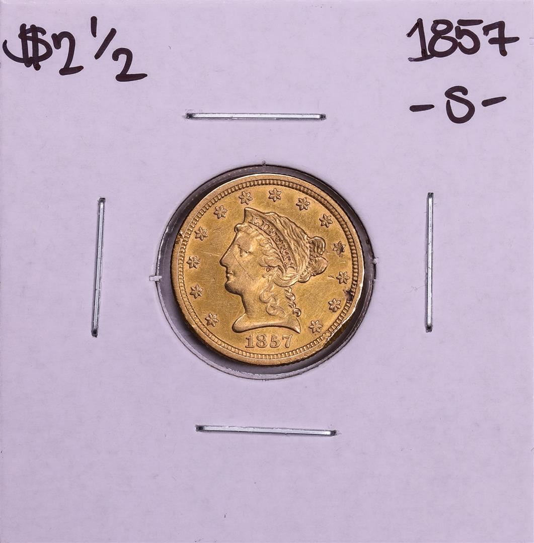 One 1857-S $2 1/2 Liberty Head Quarter Eagle Gold Coin, please note there some damage to the obverse of the coin and has a rim file as shown in the pictures.