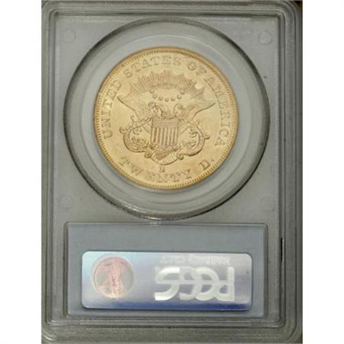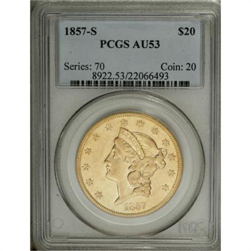 <B>1857-S $20 AU53 PCGS.</B></I> Brass-gold surfaces display traces of luster in the recesses of this S-mint issue. Sharply struck and minimally abraded.<BR><BR><B>Coin Engraver:</B> James B. Longacre<BR><BR><b>Shipping:</b> Coins & Currency (<a target="_blank" href="http://www.heritageauctions.com/common/shipping.php">view shipping information</a>)