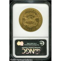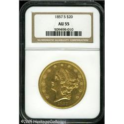 <B>1857-S $20 AU55 NGC.</B></I> Boldly defined with bright yellow-gold surfaces. Close inspection reveals original luster near the some of the protected devices.<BR><I>From The Richard J. Chouinard Collection of United States Coins, Part Two.</B></I> Lot:8970