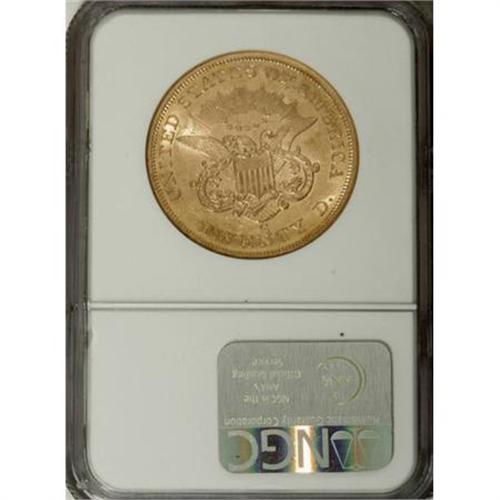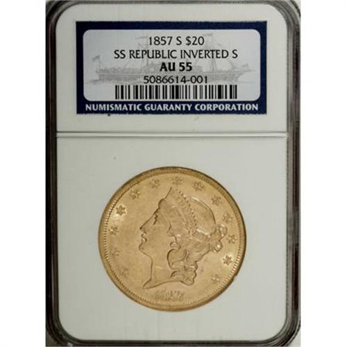 <B>1857-S $20 AU55 NGC.</B></I> Ex: S.S. Republic. This reverse die is unrecorded in Robert Evans' July 2000 <I>Numismatist</B></I> article, presumably because it was struck too late in 1857 to participate in the September 1857 <I>S.S. Central America</B></I> shipwreck. The mintmark has an unusually small lower serif (referred to as an "Inverted S" by NGC, although the mintmark could have been unevenly entered instead) and is located far right and too close to the letter N. The E in AMERICA has a broken upper crossbar. The coin itself is partly lustrous and refreshingly unabraded.<BR><BR><B>Coin Engraver:</B> James B. Longacre<BR><BR><b>Shipping:</b> Coins & Currency (<a target="_blank" href="http://www.heritageauctions.com/common/shipping.php">view shipping information</a>)