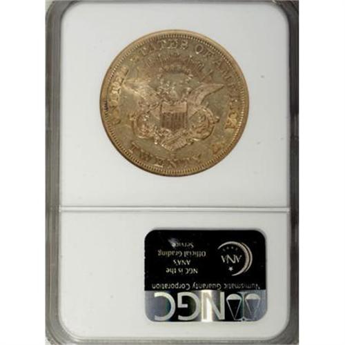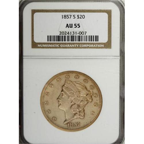 <B>1857-S $20 AU55 NGC.</B></I> A bright and flashy example, with rich orange-gold color and surfaces that are cleaner than often seen on San Francisco issues from this era.<BR><BR><B>Coin Engraver:</B> James B. Longacre<BR><BR><b>Shipping:</b> Coins & Currency (<a target="_blank" href="http://www.heritageauctions.com/common/shipping.php">view shipping information</a>)